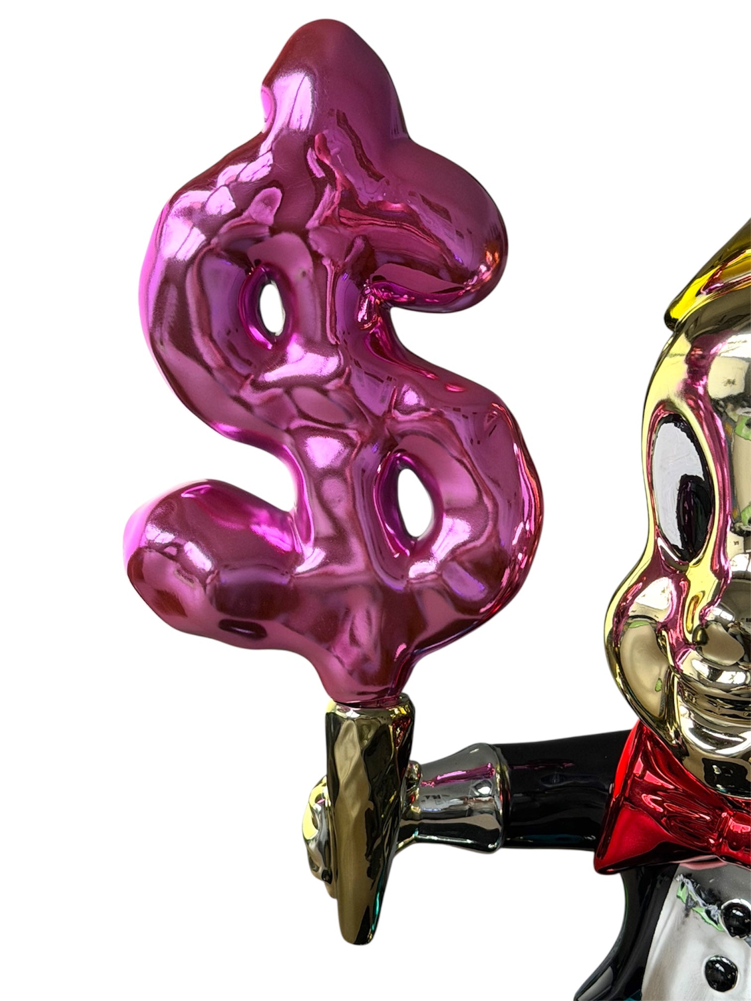 Diese außergewöhnliche Kunstfigur überzeugt durch ihre expressive Formsprache und ein glänzendes, farbintensives Finish. Die Kombination aus goldfarbenem Kopf, kontrastreicher Kleidung und einem auffälligen Symbol in der Hand verleiht der Figur eine starke visuelle Präsenz und eine spielerisch-luxuriöse Ausstrahlung.